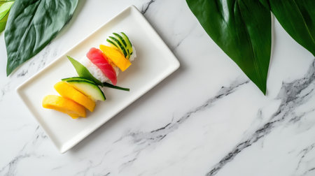 Mango sushi paired with pickled radish and wasabi on elegant marble countertop