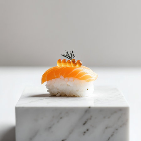 A beautifully crafted piece of sushi features thin slices of fresh salmon and a garnish of roe atop vinegared rice. The dish is elegantly placed on a marble platform, highlighting its artistry.