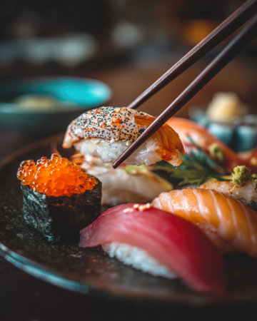 A close-up of a beautifully arranged sushi platter featuring various nigiri pieces, including salmon, tuna, and roe, with chopsticks delicately picking up one piece, highlighting the freshness and artistry of Japanese culinary tradition.