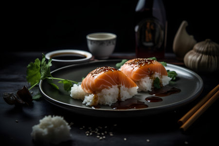 AI Generated. Sushi preparation showcases fresh salmon slices with rice on a wooden platter