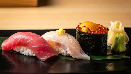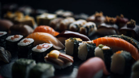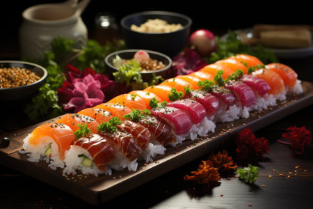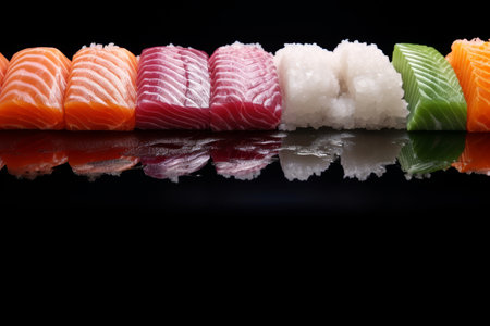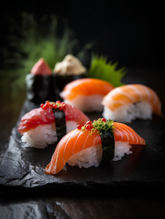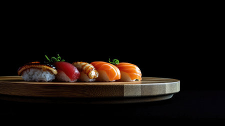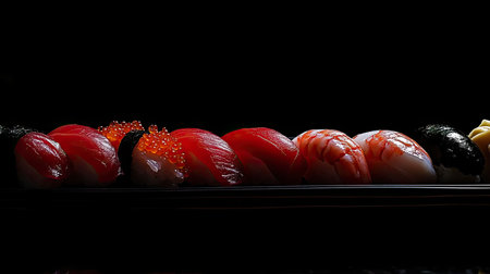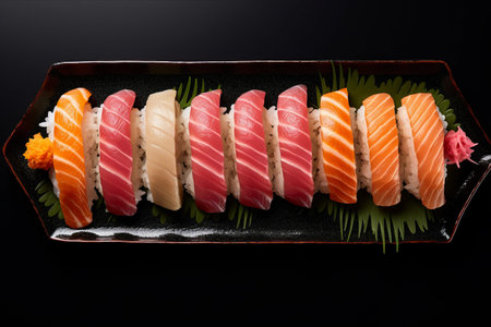 A stunning arrangement of fresh sushi on a black background, highlighting the vibrant colors and textures of fish and garnishes. Perfect for food lovers.