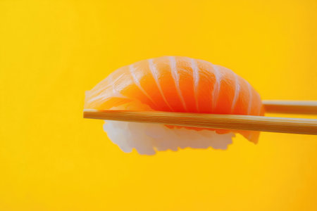 A stunning sushi slice featuring fresh fish and rice, set against a bold yellow background. Perfect for food photography, cooking blogs, or menus.