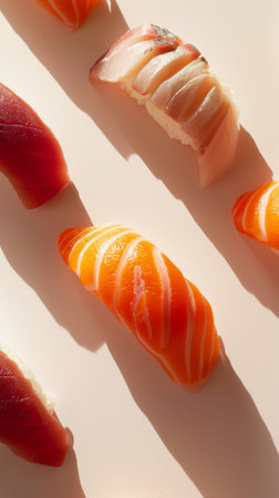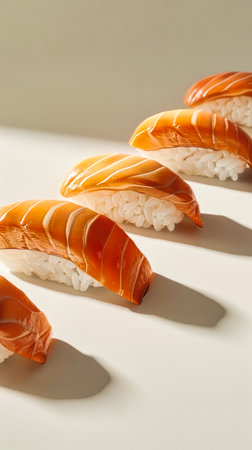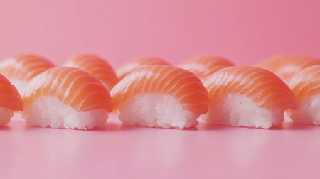 A beautiful arrangement of fresh salmon sushi pieces on a soft pink background, highlighting the simplicity and elegance of Japanese cuisine.