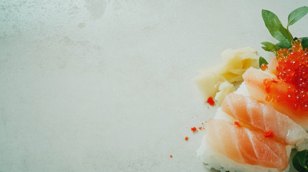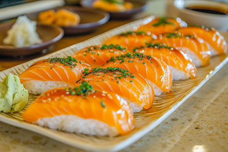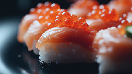 Close-up of a beautifully arranged platter of salmon nigiri topped with bright red ikura and garnished with green onions. the vibrant colors and textures highlight the elegance and freshness of japanese culinary art, perfect for gourmet dining presentations. Generative AI