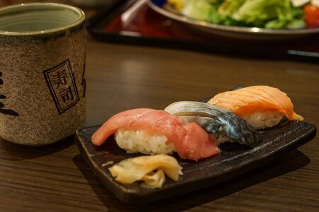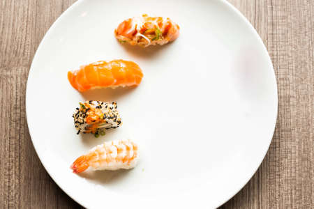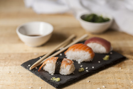 Nigiri sushi on wood table in a japanese restaurant. Copy space and top view