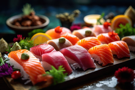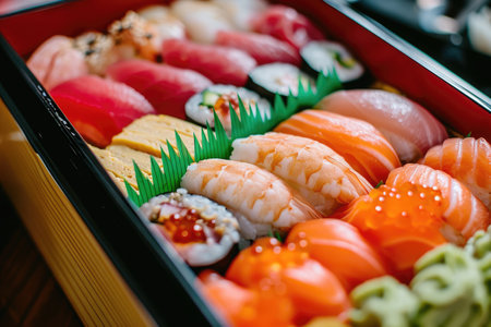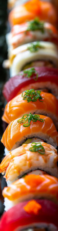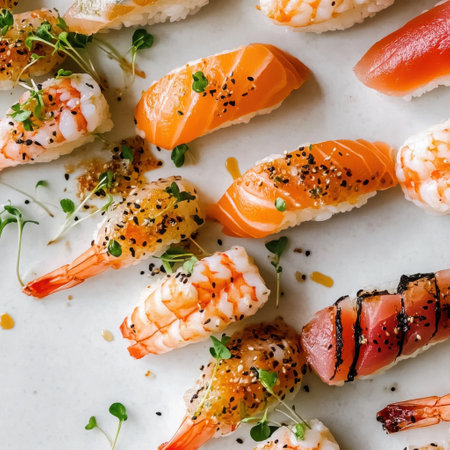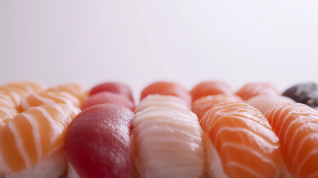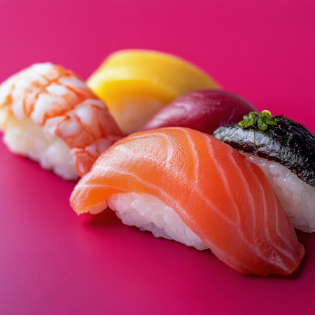 Fresh sushi assortment with vibrant colors and textures showcasing salmon, tuna
