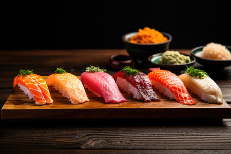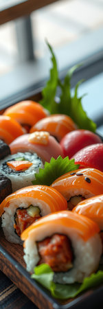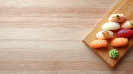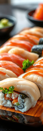 A stunning close-up shot of assorted Japanese sushi displayed elegantly on a wooden platter, showcasing vibrant colors and textures, perfect for food enthusiasts.