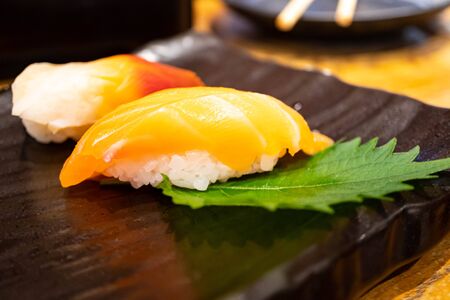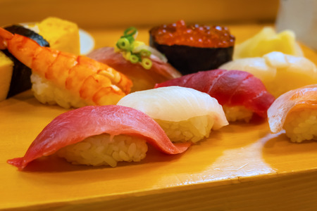 sushi japan is traditional Asian food the ingredients include rice with raw fish sweet eggs seaweed salmon uni tuna all are good and fresh, the closeup of Japan fresh national dish.