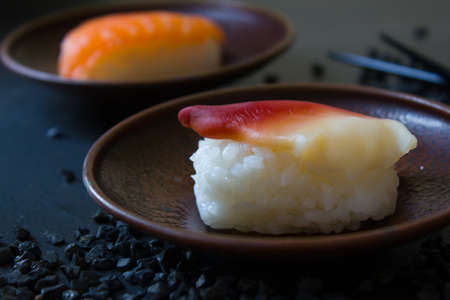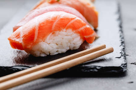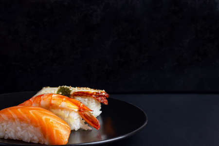 Salmon sushi nigiri on a black plate. Japanese cuisine