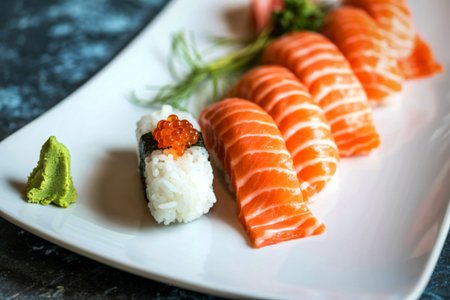 A white plate displays glistening salmon nigiri sushi, a dollop of vibrant green wasabi, and a small sushi roll topped with bright orange roe.