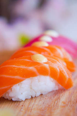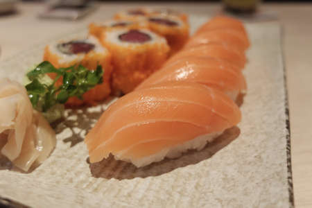 Portions of delicious sushi with salmon. Tasty traditional rice and fish dish. Japanese food and healthy eating concept.