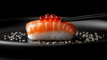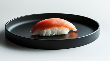 A stunning minimalist sushi presentation on a sleek black ceramic plate, showcasing a singular piece of fresh sushi. Perfect for modern dining aesthetics.