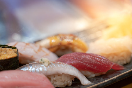 Various types of nigiri sushi in a cozy japanese sushi shop, food photography at evening