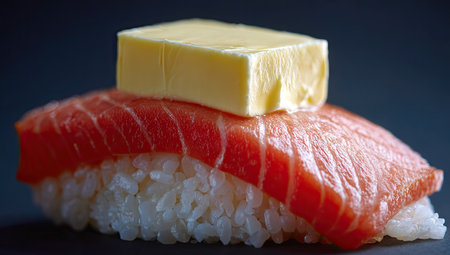A close-up image showcases sushi topped with a square of butter. The composition highlights the sushi's rice, raw fish, and the yellow butter. The food is set against a dark backdrop, with soft lighting enhancing the textures. This image can be used in culinary projects and food-related publications.