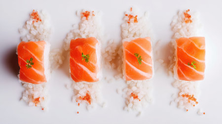 A visually appealing arrangement of fresh salmon sushi rolls garnished with a green herb, served on a white plate with rice and red fish roe, perfect for food photography.