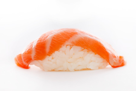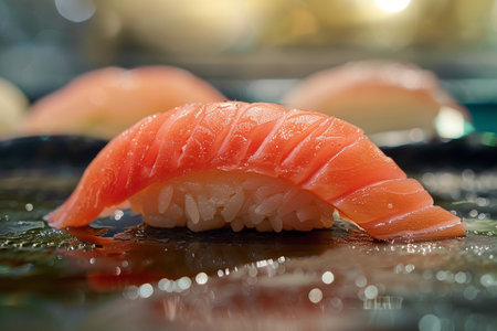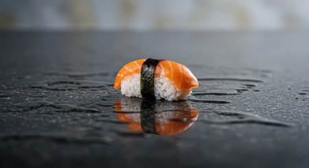 A meticulously prepared piece of fresh salmon sushi nigiri, featuring vibrant orange fish atop white rice, elegantly presented on a wet