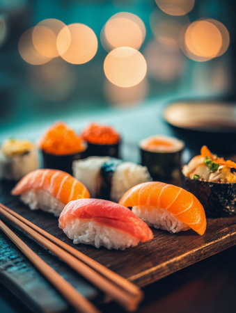An inviting display of vibrant sushi slices and rolls artfully arranged on a textured wooden board, illuminated by soft, glowing lights for an intimate dining feel.