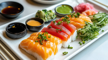 A high-end sushi platter with vibrant slices of fish, perfectly arranged with chopsticks and dipping sauces, on a clean, minimalist table for a refined dining composition
