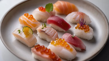 japanese sushi(tuna,egg,shrimp,caviar) and green bud on plate with minimal style