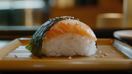 This close-up image showcases a beautifully crafted salmon sushi piece served on a wooden plate. The vibrant colors and textures highlight the freshness of this traditional Japanese dish.
