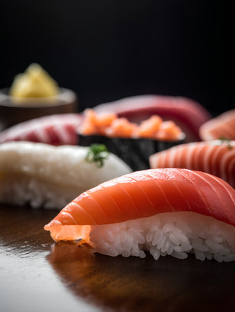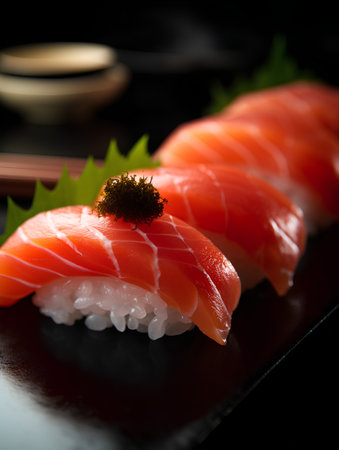 Salmon belly sushi set with lowlighting darkshadow and low aperture depth of field style.