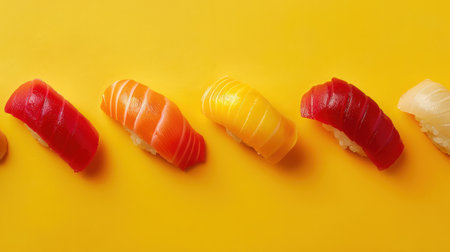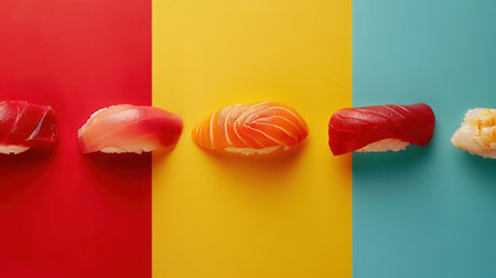 Various Japanese nigiri on a different color strip background, photo for advertisement, Generative AI.