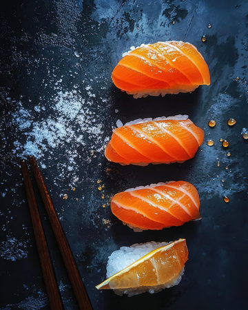 Salmon nigiri sushi with chopsticks on dark background, top view