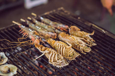 Grilled fresh seafood, food background Barbecue Cooking BBQ seafood on fire.