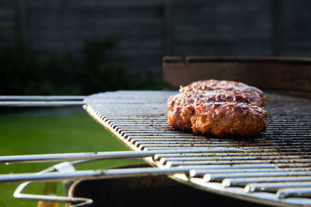 Close up photos of big delicious hamburger on grid barbecue at backyard in summer