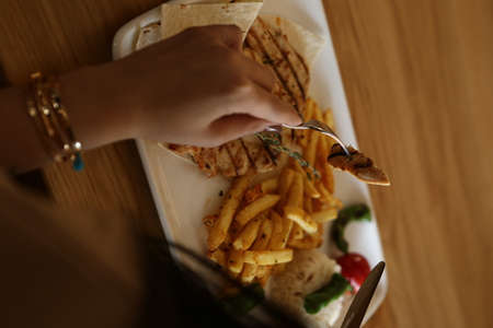 Woman taking a photo food by smartphone in restaurant,Enjoying with meal