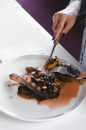 appetizing grilled meat on fire close-up. beautiful presentation of the dishes in the restaurant