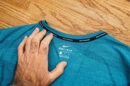 Paris, France - Jul 13, 2019: Man hand POV unboxing unpacking admiring latest sport clothes equipment for running manufactured byu Nike sportswear on wooden background tab le