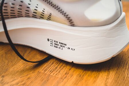 Paris, France - Jul 8, 2019: close-up macro shot of new professional Nike running sport shoe on wooden floor Nike Zoom Fly SP FInnovation concept DSGN V7.2