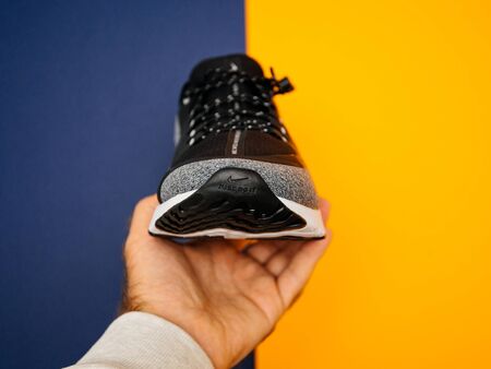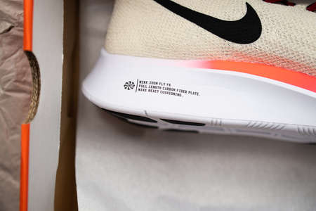 Paris, France - Jul 8, 2019: Side view of new Nike Zoom Fly Flyknit 2 running shoes on wooden table detail of sole