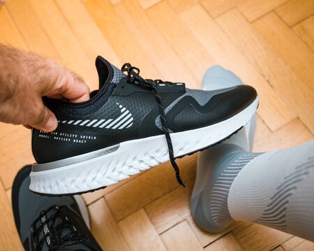Paris, France - Oct 24, 2019: POV Professional runner preparing to next marathon during winter measuring new professional running shoe manufactured by Nike model Odyssey React Shield 2