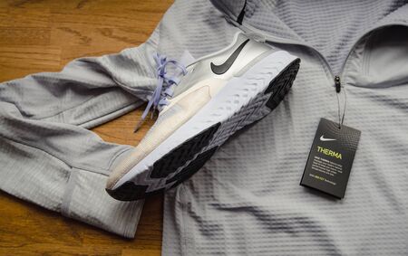 KHARKOV, UKRAINE - DECEMBER 20, 2020: Nike brand clothes sportwear kit. Nike is American multinational corporation engaged in manufacturing and worldwide marketing of clothes and footwear