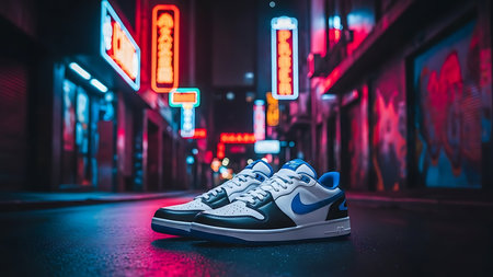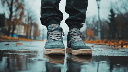 A pair of stylish sneakers stands on a reflective wet pavement in autumn, surrounded by fallen leaves, capturing the essence of urban fashion and casual lifestyle.