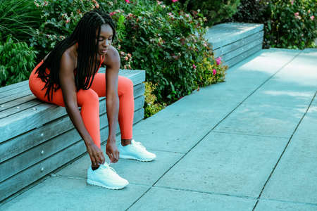 Close-up of athletes tying shoe straps in preparation for training after the COVID-19 crisis.