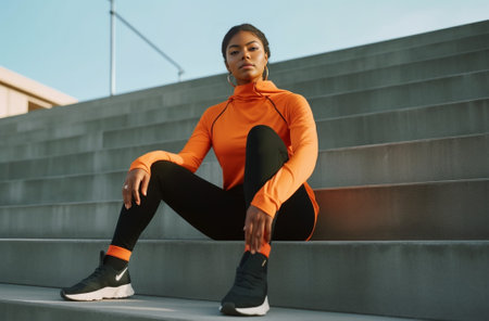 Beautiful young African woman in sports clothing holding smart phone while sitting on sports track outdoors : Generative AI