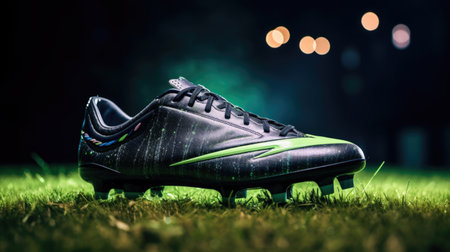 Professional soccer shoes cleans close-up on green grass with an outdoor stadium in the background. It's a great illustration for advertising or promotional materials.