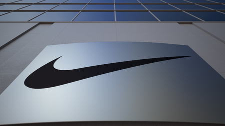 Outdoor signage board with Nike inscription and logo. Modern office building. Editorial 3D