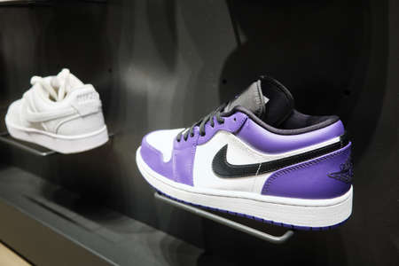 Nike Air Jordan 1 Low Court Purple colorway sneakers at retail store display. Mersin, Turkey - November 2020