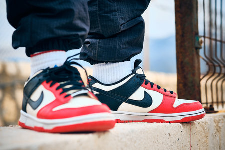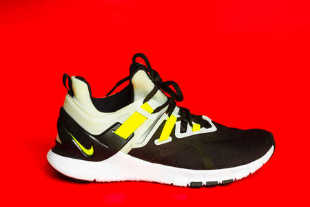 Israel. Rishon Lezion 05. 14. 2022. New Nike sneaker on red background. Mens sports shoes. Sport.