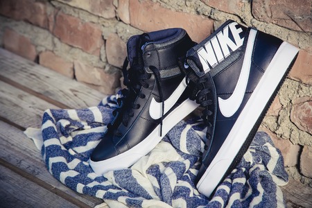 SAMARA, RUSSIA - February 11, 2017: Blue Nike sneakers for running in red box, football, training, showing the Nike logo, illustrative editorial