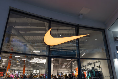 Russia, Krasnoyarsk, December 2, 2019: Nike logo on the facade of the brand store of the international world manufacturer of sportswear