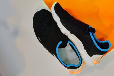 Johannesburg, South Africa - September 12, 2016: Colorful Nike footwears exhibition on black shelf in store of Johannesburg, South Africa. Nike Inc. is an American multinational corporation for the design, manufacturing and worldwide marketing of sportwea