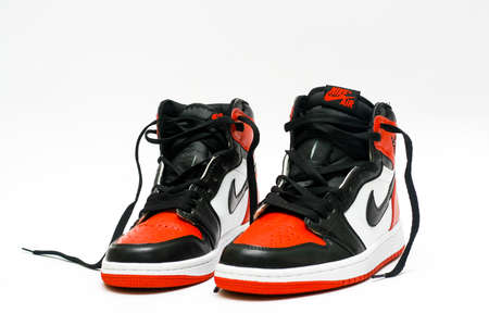 KUMASI, GHANA - May 13, 2020: sneakers on a white background with little shadows around the sneakers