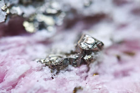 Pink crystals Rhodochrosite with particles of Pyrite. Natural texture of mineral for background. Beautiful background and wallpaper. Macro