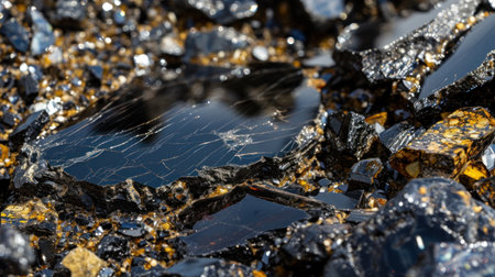 A closeup of obsidian with a smooth mirrorlike surface that reflects the surrounding environment giving it a beautiful otherworldly quality