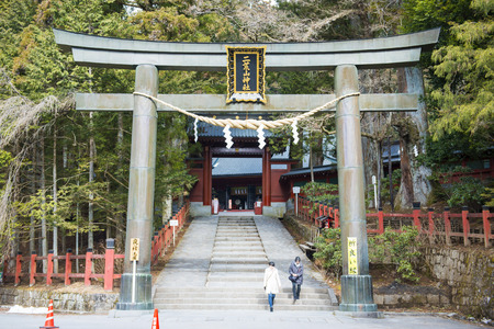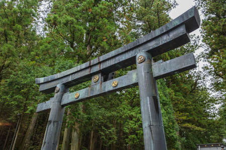 Nikko, Japan - February 23, 2016 : Traditional Torii gate at the entrance of Taiyuin-byo Temple, Nikko, Japan, landmark